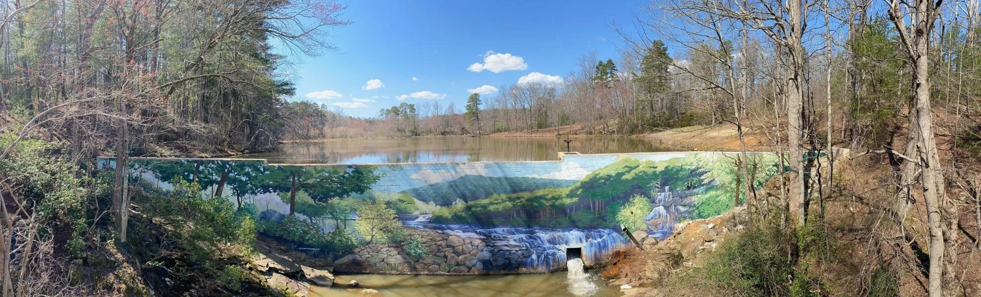 Importantly, the property provides direct access to the Mountains-to-Sea Trail, linking hikers from Clingman’s Dome in the Smoky Mountains to Jockey’s Ridge on the Outer Banks, along with a trail to Lake Klondike (just adjacent to Grassy Creek V&W) and the stunningly captivating mural on the dam wall face by acclaimed artist Eva Crawford. Grassy Creek also offers access to trails leading to other scenic destinations such as Carter Falls and also provides access to NC’s first ‘Forest Bathing’ Trail—the newest addition on Grassy Creek property by the Elkin Valley Trails group—all just perfect for attracting visitors and outdoor enthusiasts to Grassy Creek Vineyard & Winery.